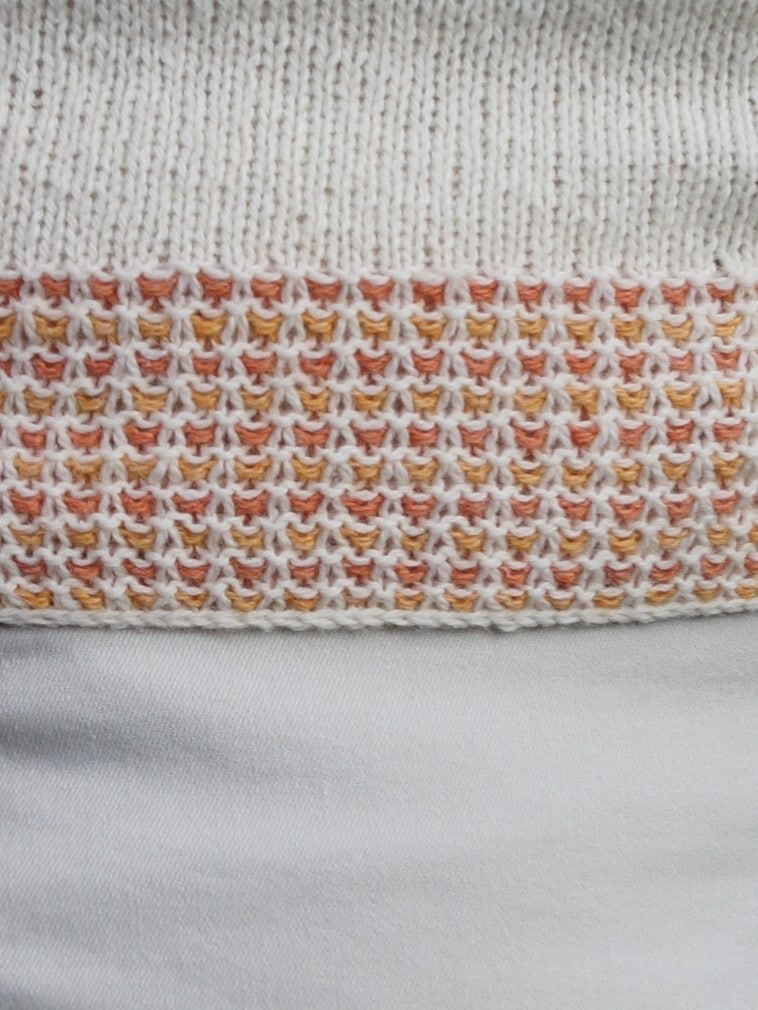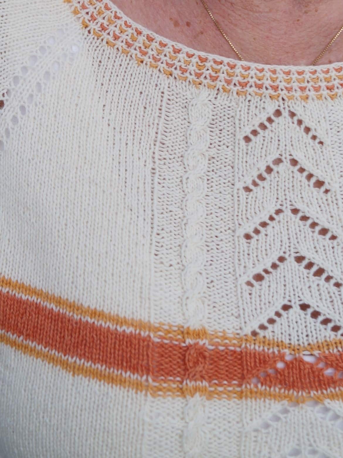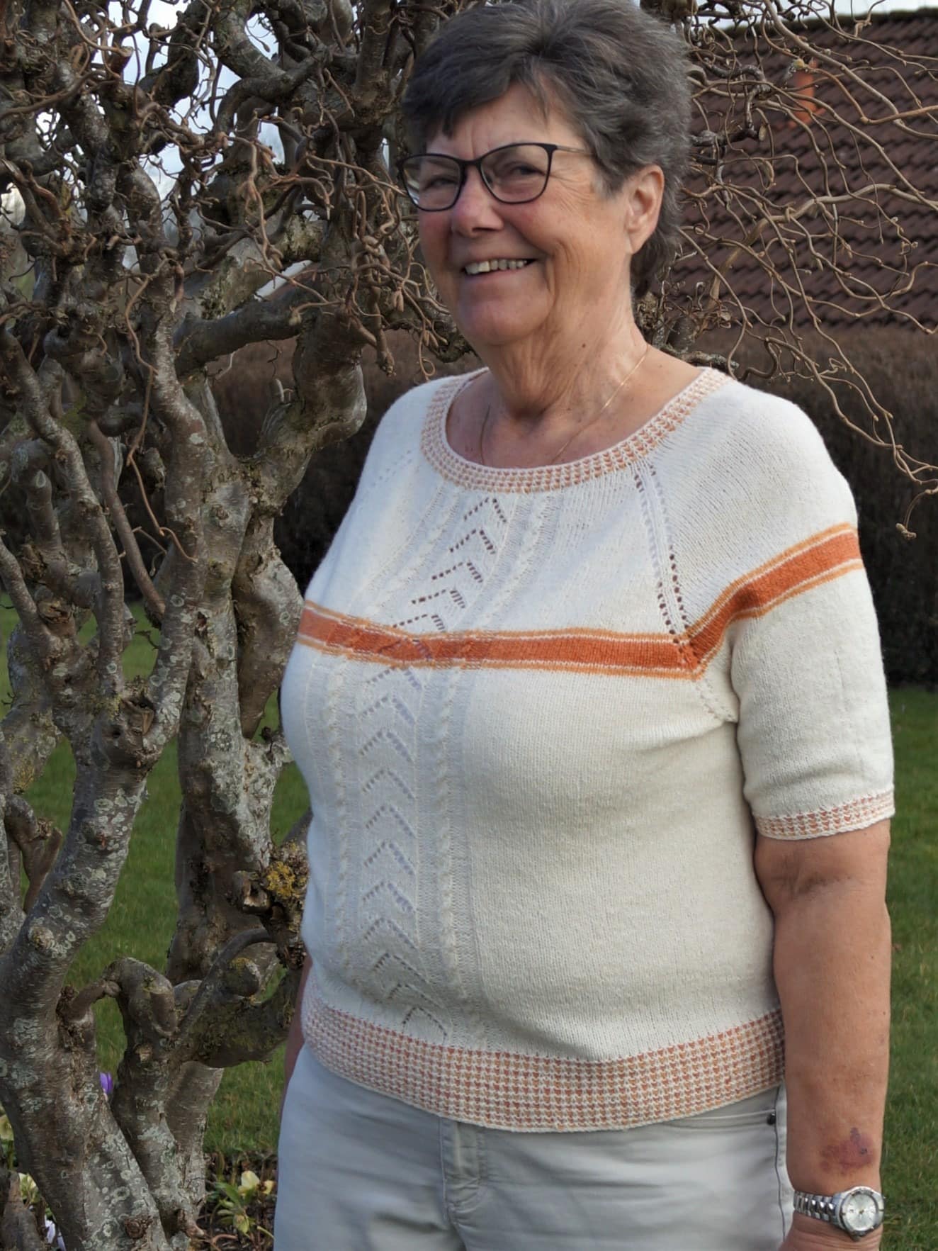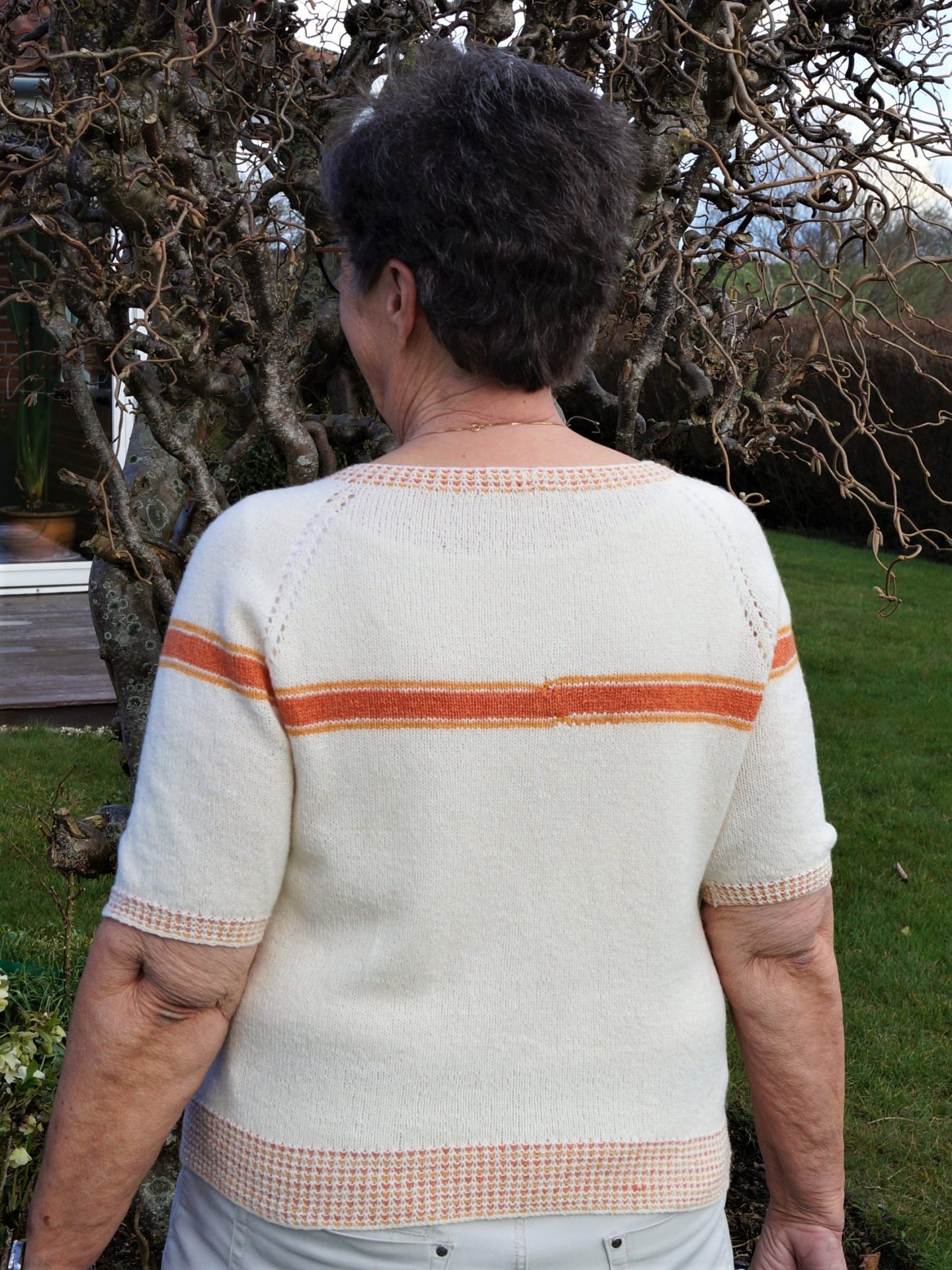 Sommerbluse strikket oppefra med vævestrikkede kanter og smukt mønster foran