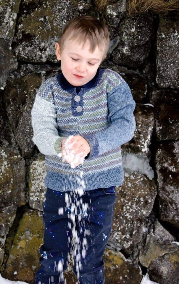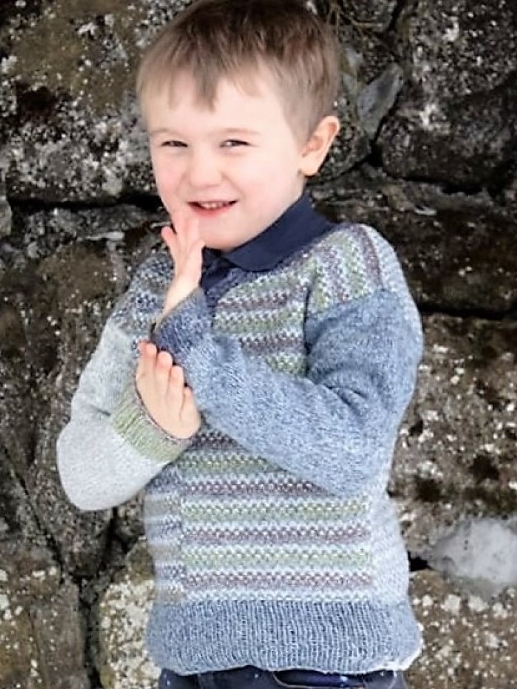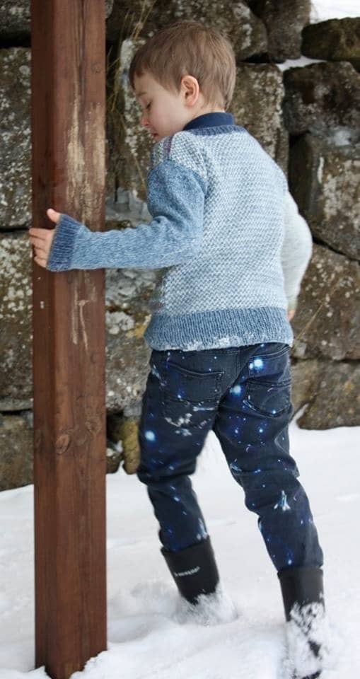 Strikket med dobbelt garn på rundpind 4 og 6 og strømpepinde 4 og 4,5