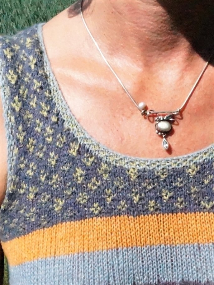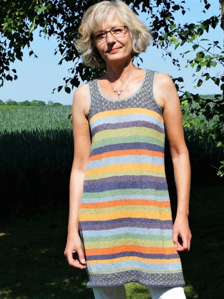 Tunika med stjerner i kant og på bærestykke. Kan strikkes i mange forskellige farver.