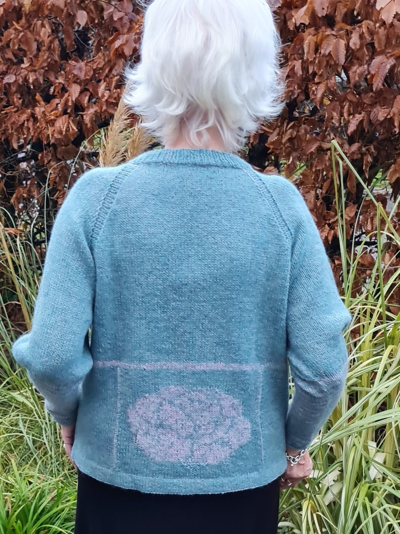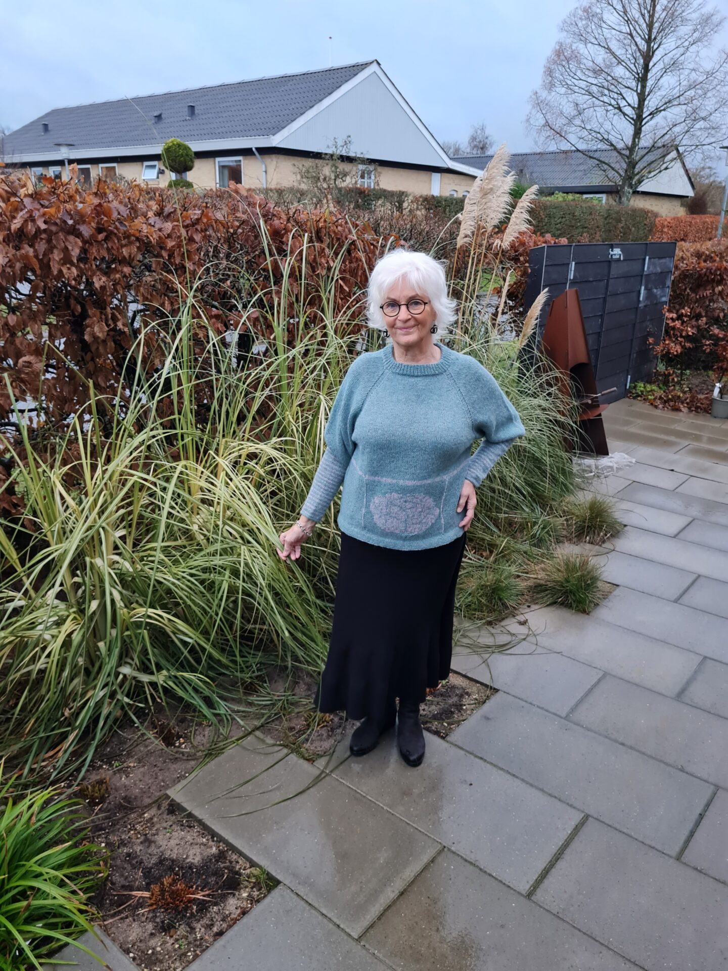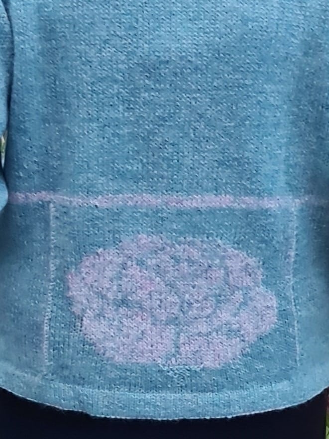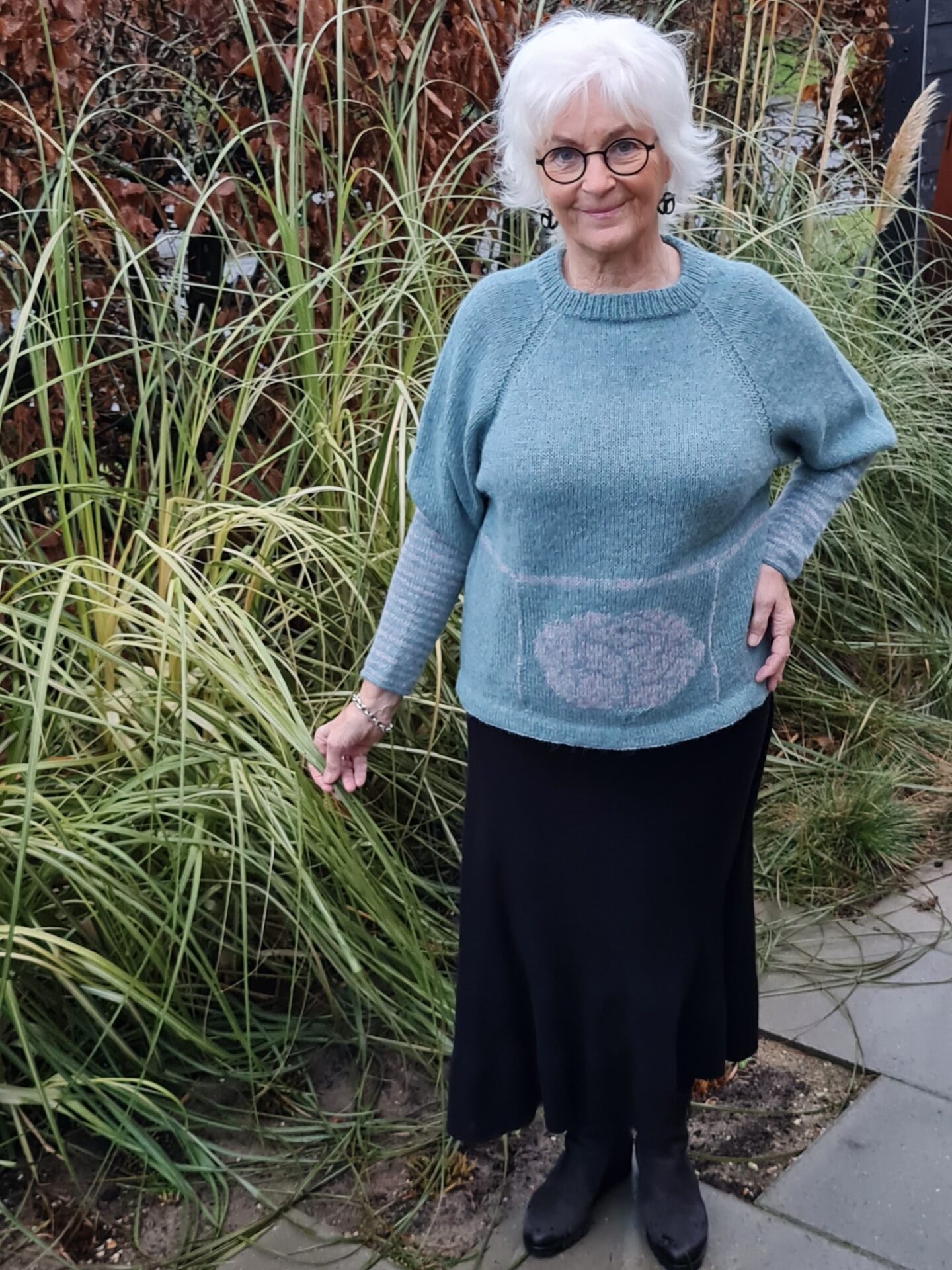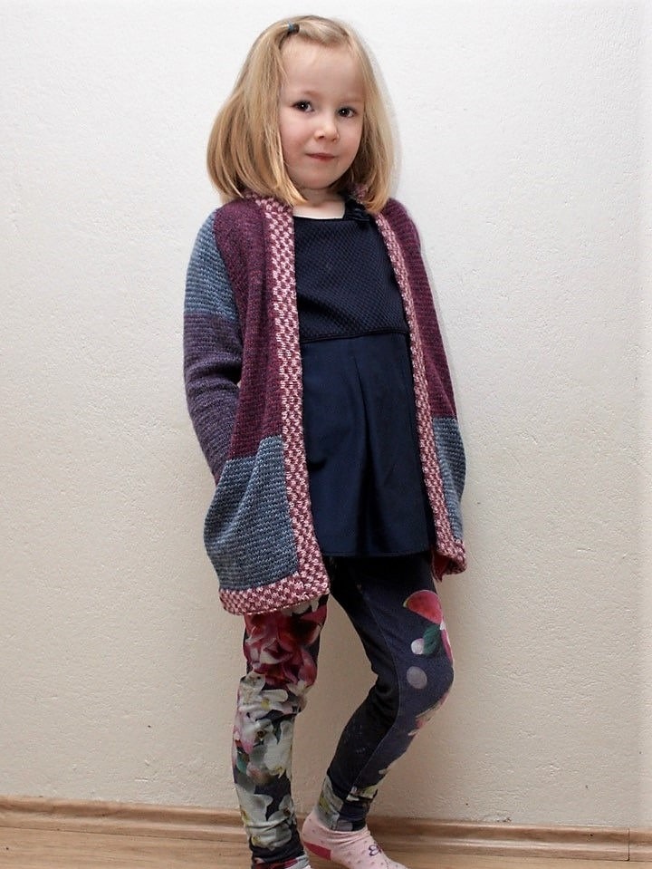 Strikket oppefra med rundpind nr. 4 og 4,5 (40 og 60 cm) og strømpepinde nr. 3,5
