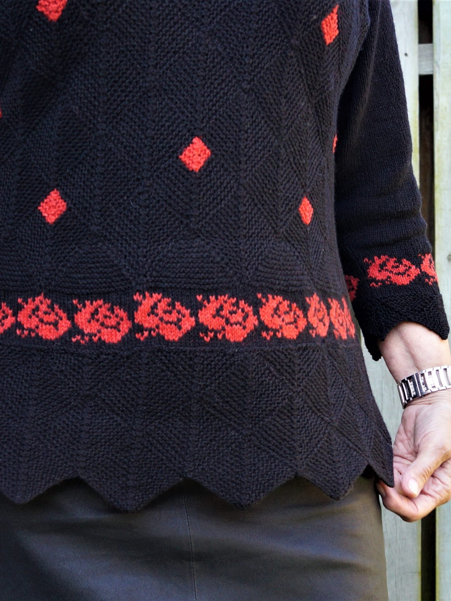 Dominostrikket trøje med rosenbort og små røde”toppe”.