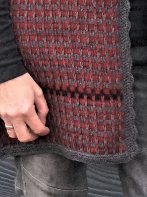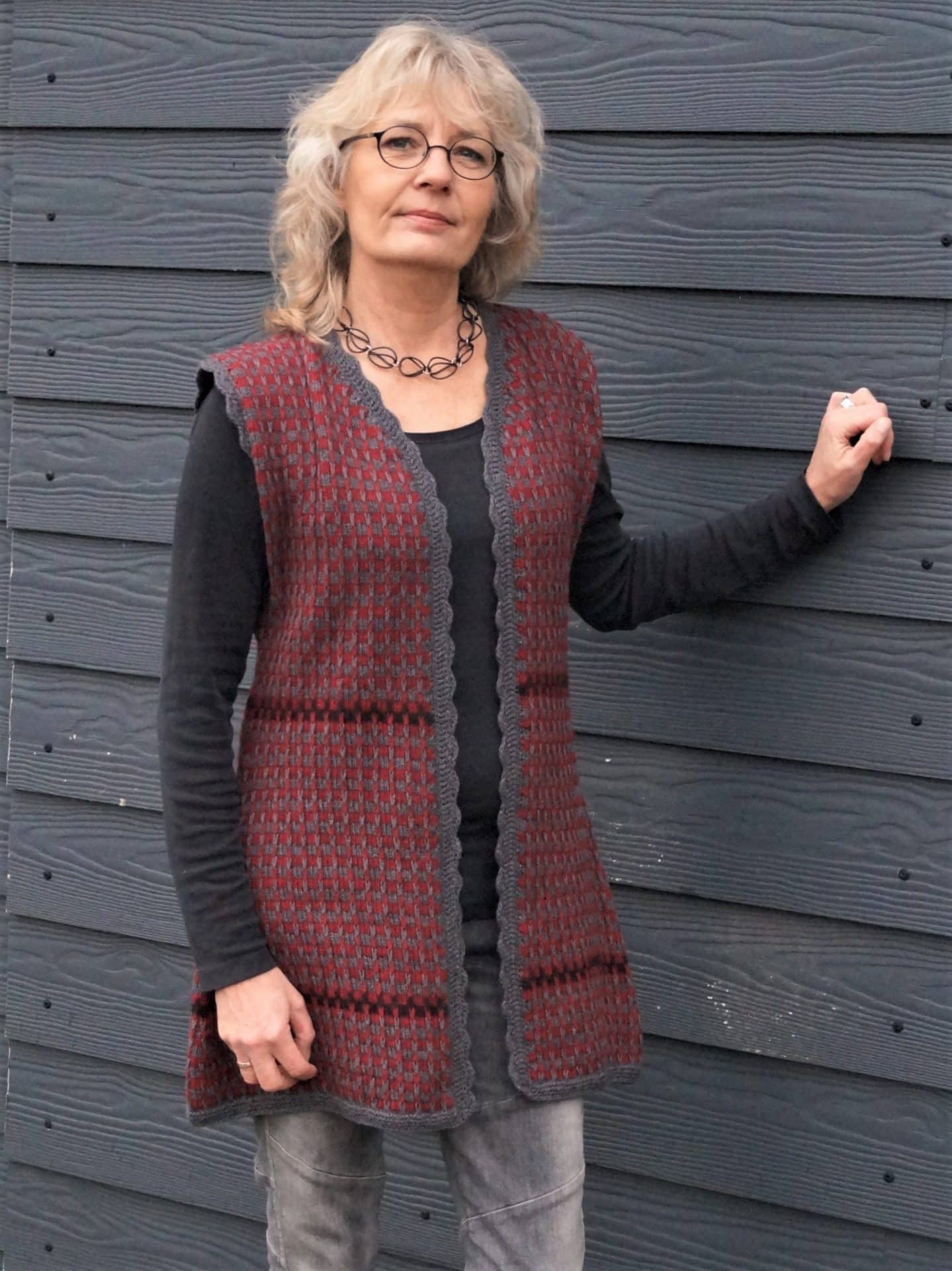 A-formet lang vest strikket i vævestrik med hæklet kanter
