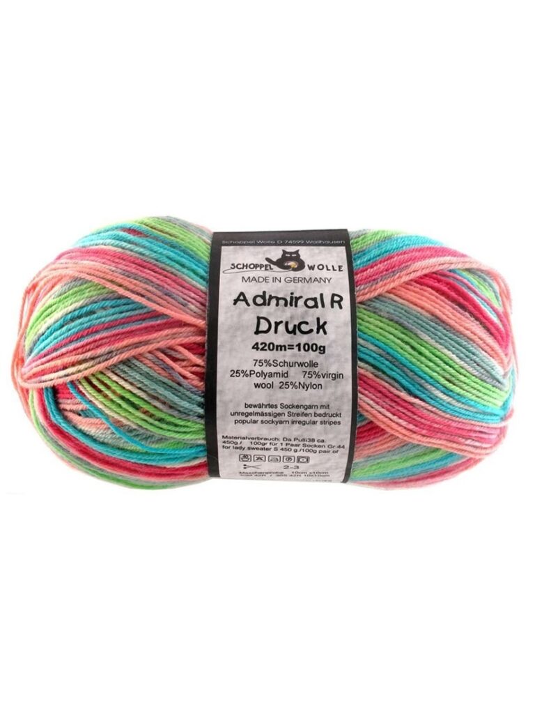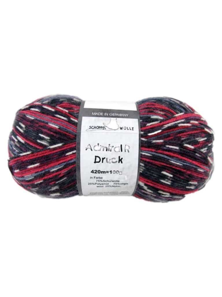 Vores strømpegarn “Admiral R Druck” er 75% uld (superwash) og 25% Polyamid.
